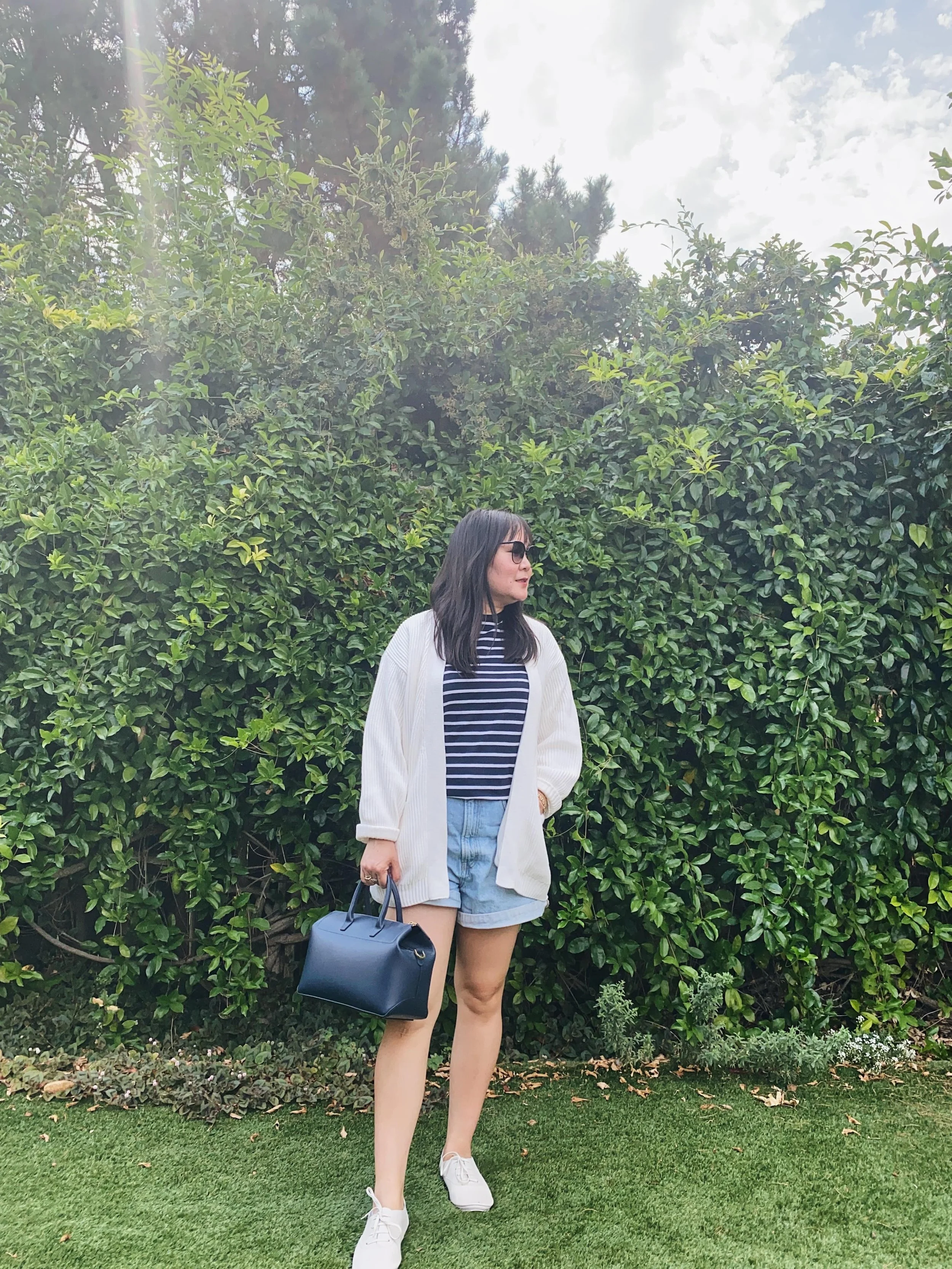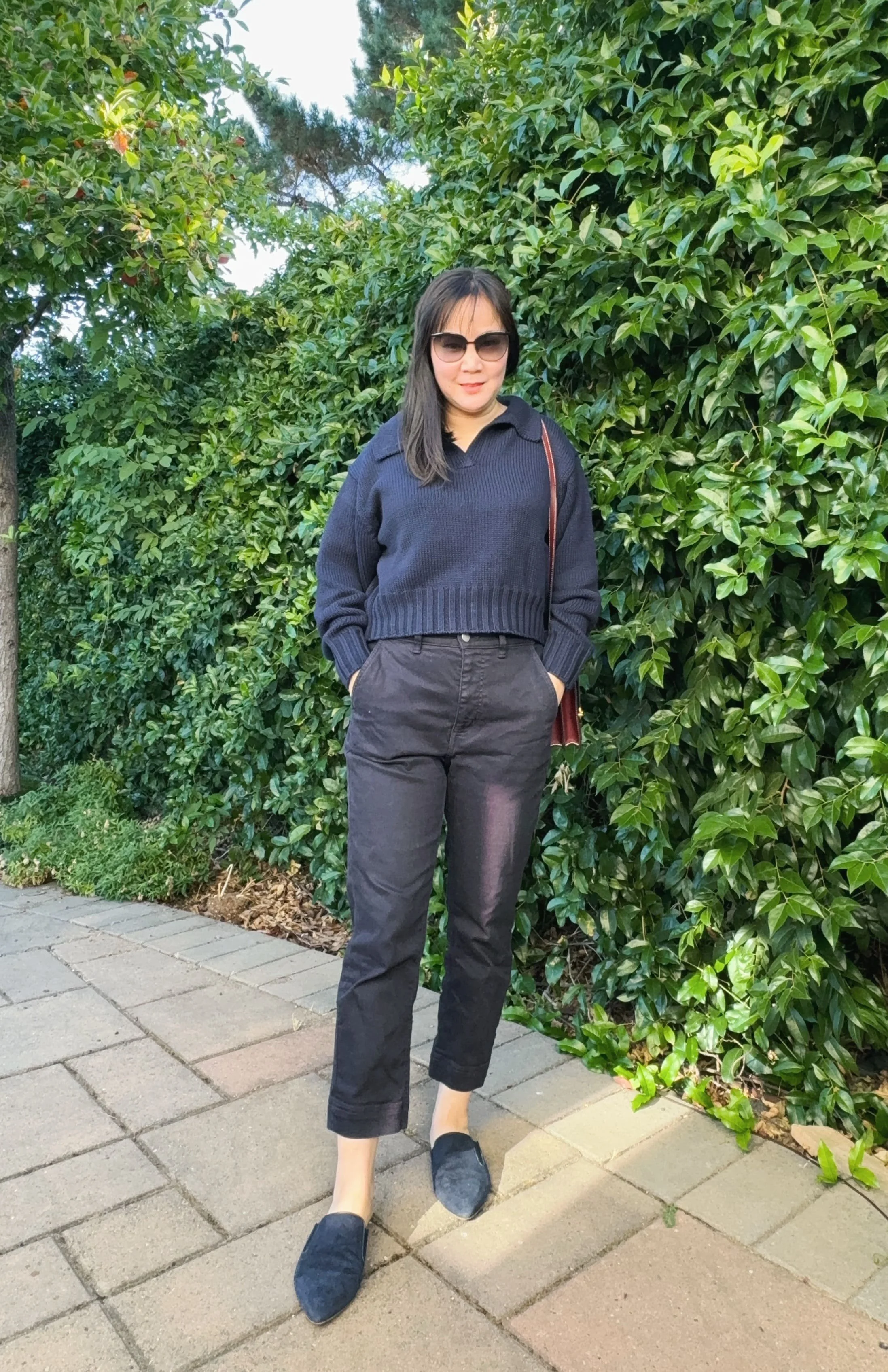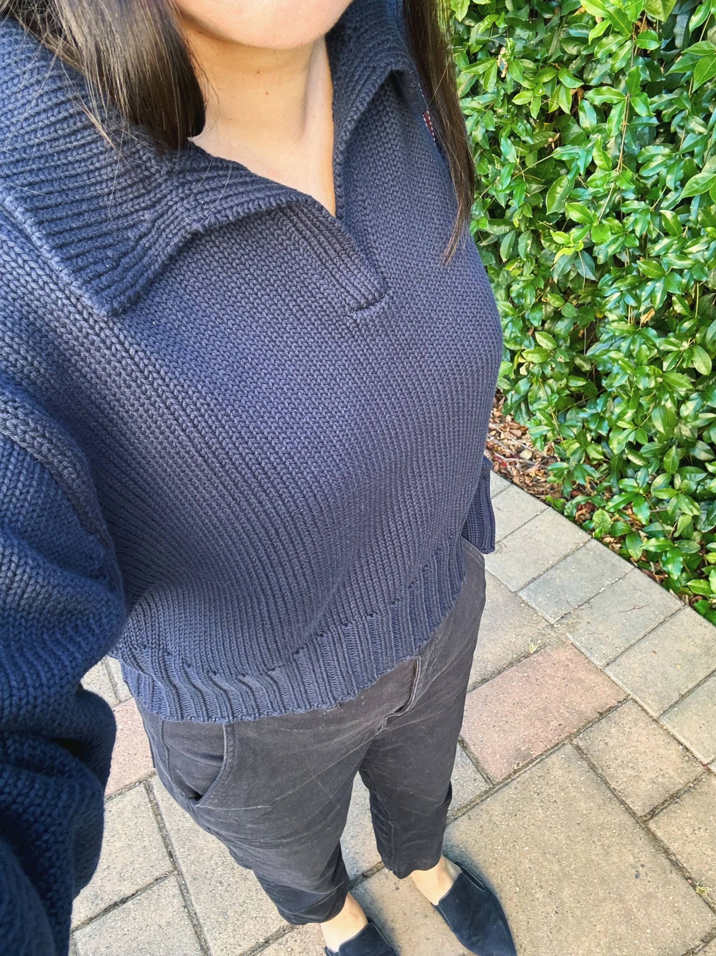 100% Organic Cropped Cotton Polo Sweater (new for 2023 and pictured above): Since I was such a fan of Quince’s organic cotton line, I decided to try out their cropped cotton polo sweater this year. And I looooove it! The cropped length is perfect for my 5’4” frame and I love the 90’s J.Crew vibes of the polo style. And the organic cotton is a nice tight thick weave, just like my other organic cotton sweaters from Quince (which one year on, is still in great shape—it hasn’t stretched out or pilled at all). I would totally get this sweater again if Quince came out with other colors. Right now they only have the navy, white, and striped (I’m thinking about the striped one but I’m not really a fan of the thickness of the stripes).