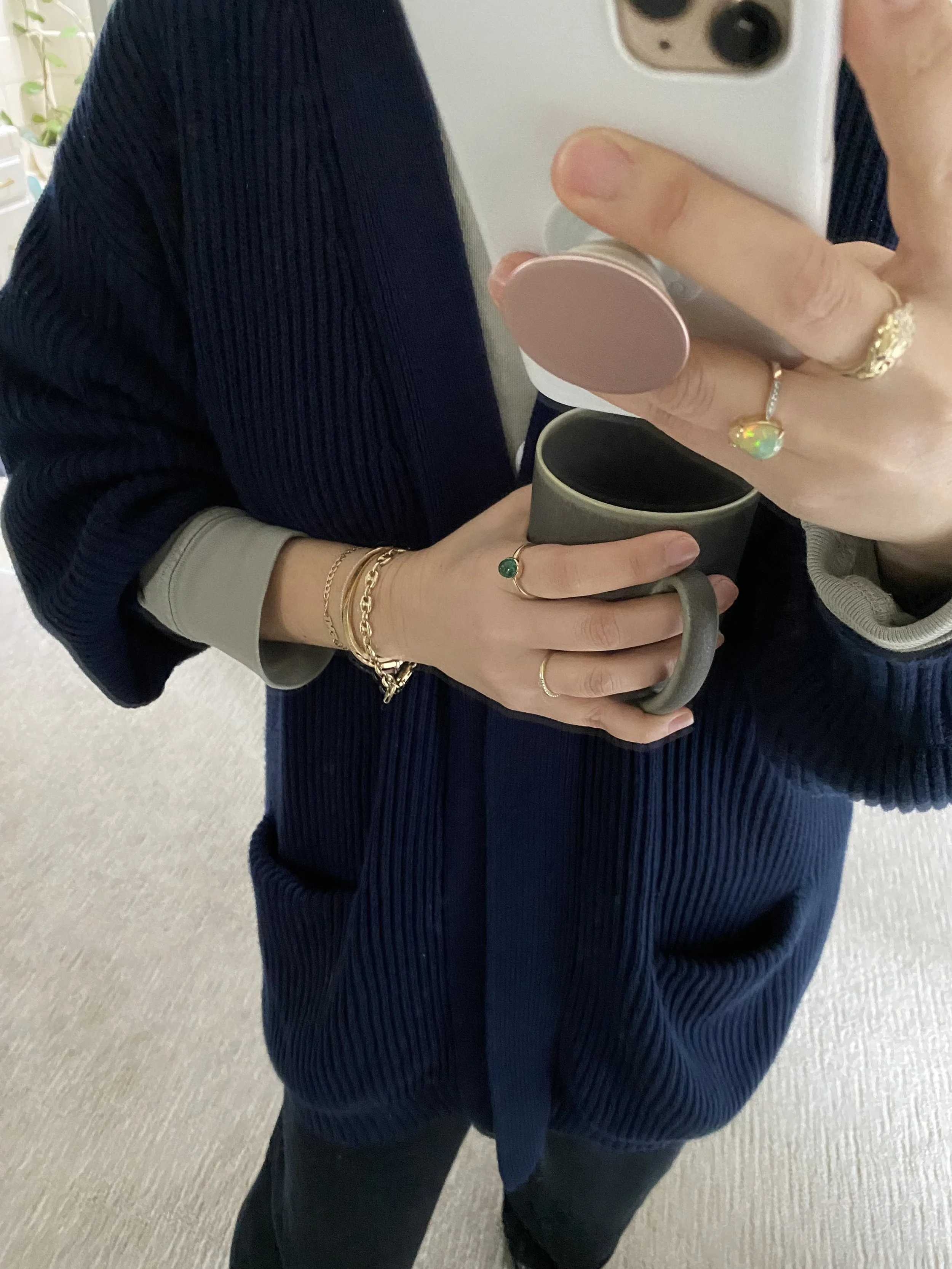 100% Organic Cotton Oversized Cardigan (worn in the two photos above): This is by far my favorite Quince sweater. It’s super comfy and wears well. I like to so much that I have four of these (in navy, black, camel, and white). Excessive? Yea I know, but I am constantly wearing them. In the fall I wore it like in the outfits above and in the winter I wear them layered over my Mate the Label sweatshirt at home. It’s become part of my everyday at-home outfit (pictured below). And even with all that wear there’s no pilling and everything looks as good as the day I bought it. The only thing is that washing this sweater (I do it in the washing machine, in a netting, on delicate) is kind of a hassle because it’s so big and bulky. I also lay it out on a towel to dry to prevent the sweater from stretching out. But with good care, this sweater should last you a very long time.